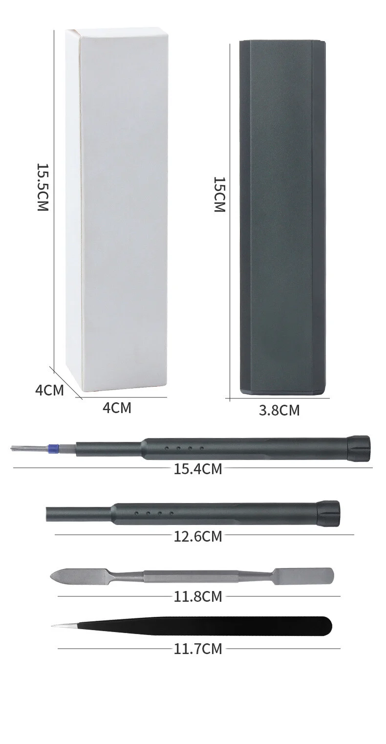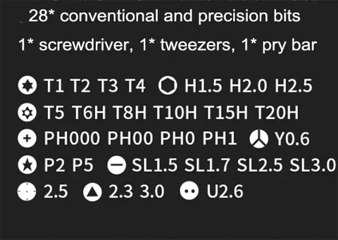 Tato sada šroubováků obsahuje 28* konvenčních a přesných bitů, 1* šroubovák, 1* pinzetu, 1* páčidlo. Vylepšený prodloužený vrták je o 10 mm delší než obyčejný, což je výhodné pro demontáž a montáž hlubokých šroubů.